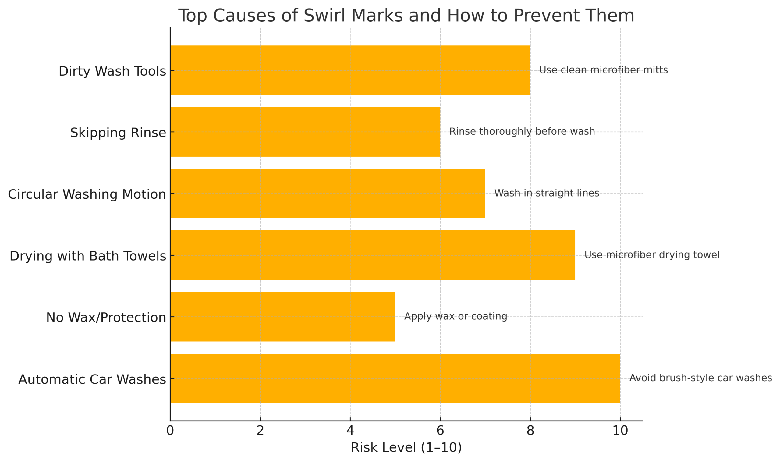 Here’s a visual chart highlighting the top causes of swirl marks and how to prevent them, with a risk level for each.